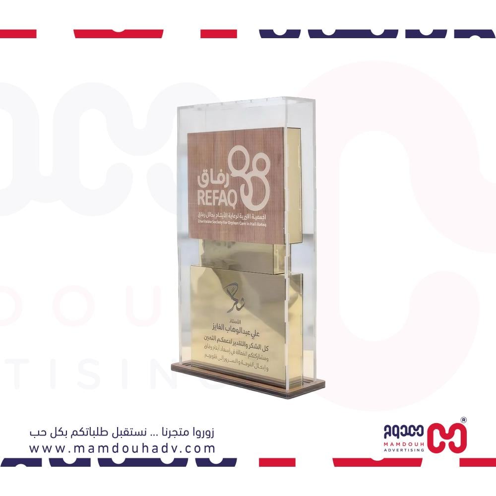 درع تكريم فاخر مصنوع بدقة من الاكريلك عالي الجودة مزود بمرايا ذهبية تضيف لمسة من الفخامة مع تفاصيل خشبية أنيقة وقاعدة خشبية متينة تضيف لمسة من الفخامة، يأتي الدرع مع بوكس أكريلك شفاف يعكس جمال التصميم ويوفر حماية إضافية.