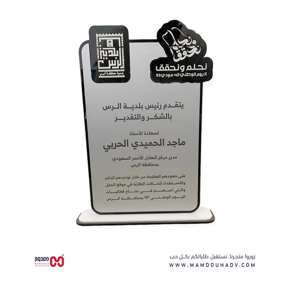 درع شكر وتقدير بشعارك مع اضافة عبارة من تأليفك بشكل جميل لعام 2024 متوفر بالعديد من الألوان والمقاسات يمكن استخدامه في العديد من المناسبات والحفلات والتكريم.
